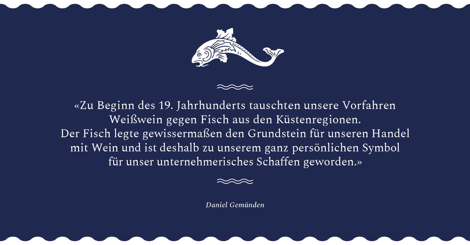 Was hat denn Wein mit einem Fisch zu tun? Augenscheinlich erst einmal gar nichts. Wirft man allerdings einen Blick in die Historie des Familienweinguts »Gemünden«, so erfährt man, dass dessen Gründer zu Beginn des 19. Jahrhunderts in den Küstenregionen Wein gegen Fisch tauschten. Der Fisch legte somit gewissermaßen den Grundstein für den Handel mit Wein und steht deshalb heute als Symbol für das unternehmerische Schaffen des Familie Gemünden.